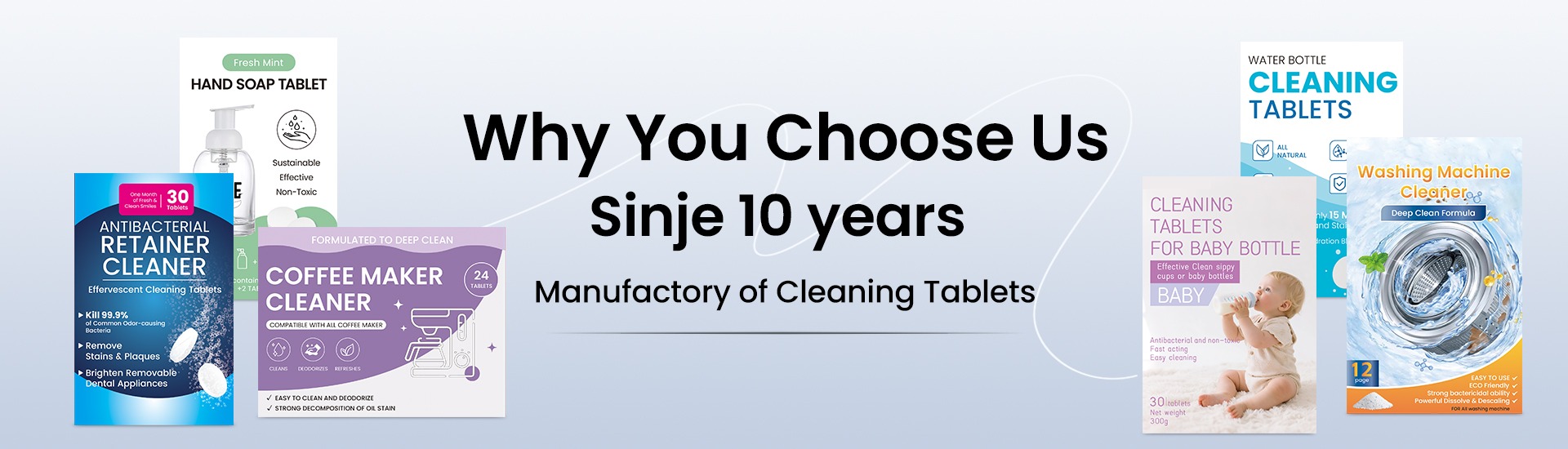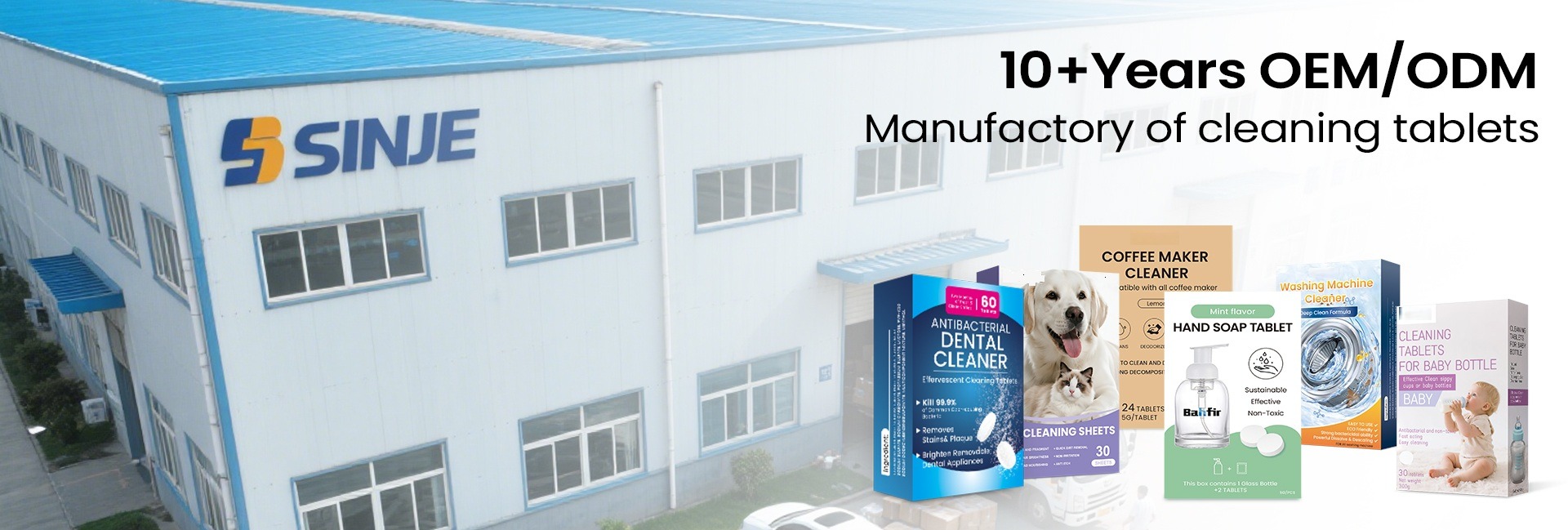 As the source factory in the field of cleaning products for 10 years, sinje focuses on the development and production of oral cleaning tablets and household cleaning tablets. The company has 8000 square meters of modern factory, 2 independent research and development centers (R&D), equipped with more than 100 people, from product research and development, production to quality control to form a whole chain closed loop, daily production capacity is stable, can meet the needs of multi-specification, multi-scene customization.